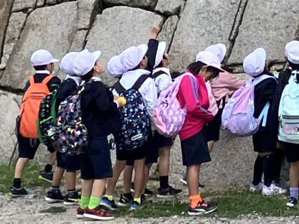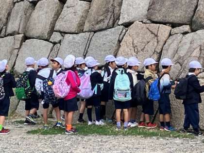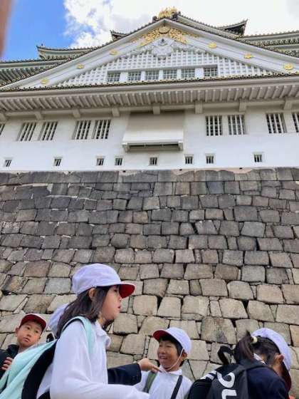 大阪城天守閣の裏で、石垣を触ります。大きな石垣を間近に見て触って、「ワー!」