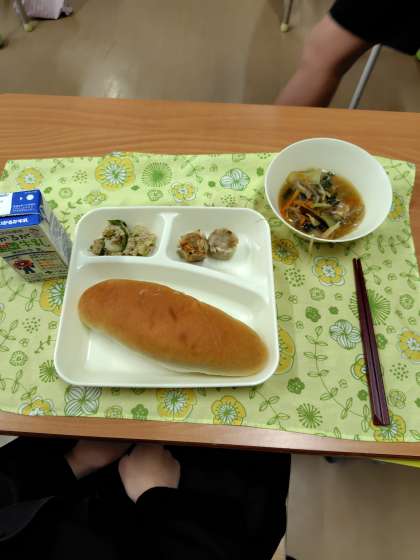 今日の献立は、コッペパン、牛乳、焼きシュウマイ、中華みそスープ、ツナと野菜のオイスターソースいため、いちごジャムです。
