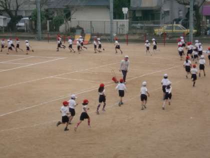 1年生の体育科の学習では、運動場をぐるぐると走っていました。