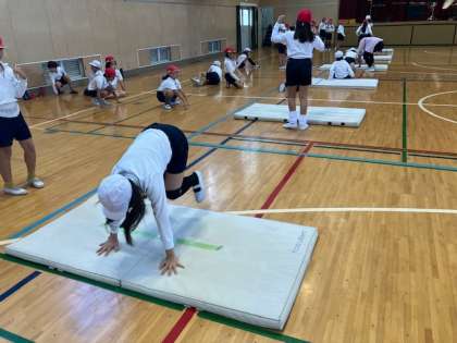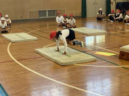 頭の中だけでなく、マット上で実際にイメージトレーニングをします。これができていれば、箱になっても楽々に跳べます。