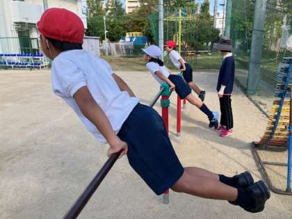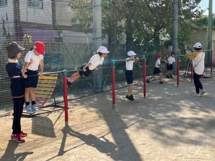 2年生の体育。今日は、鉄棒にチャレンジしています。鉄棒に飛び乗って、腕とお腹で支えてツバメさんのようになる練習をしています。