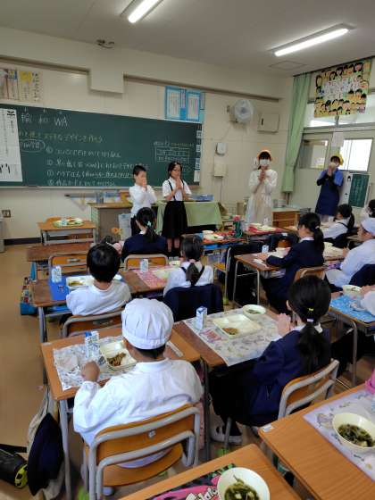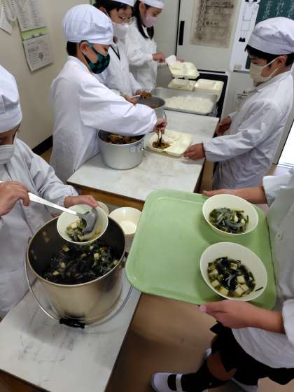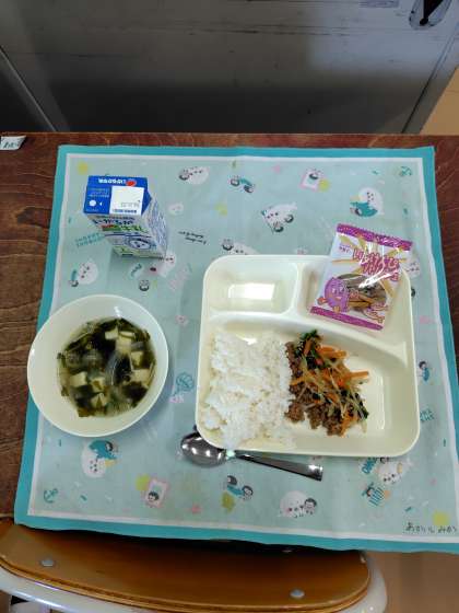 今日の献立は、ごはん、牛乳、ビビンバ(肉)、ビビンバ(野菜)、わかめスープ、いもけんぴフィッシュです。
