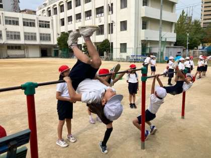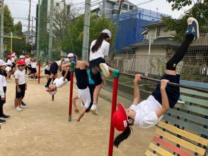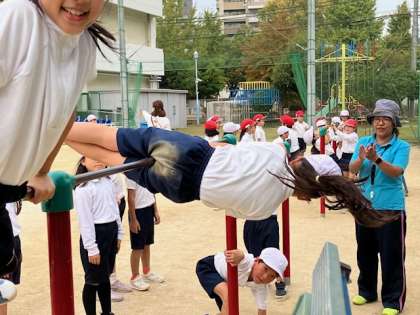 鉄棒をしています。この種目では、でき具合に個人差が出やすいのですが、すごい回り方してる子もいました!