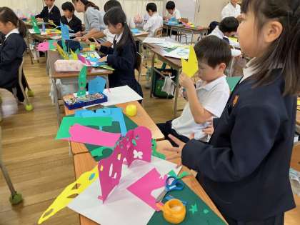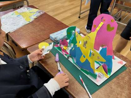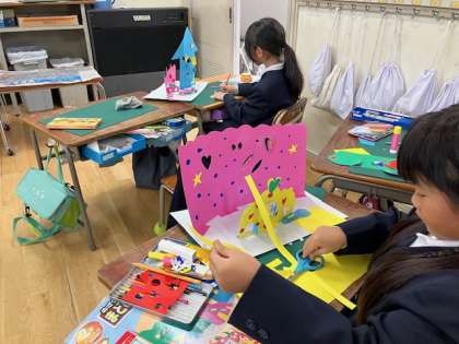 2年生の図工の時間。「窓のある家」という設定で、色紙を使って自由に家を作っています。