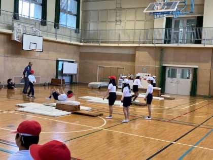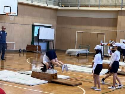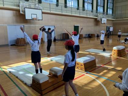 4年生の体育の授業。跳び箱に取り組んでいます。色んな跳び方や上達段階に応じて、それぞれの列で練習をします。