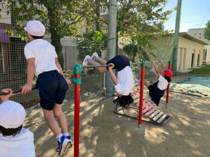 鉄棒をしたり、ボール運びゲームで走ったりして、いい気持ちです!