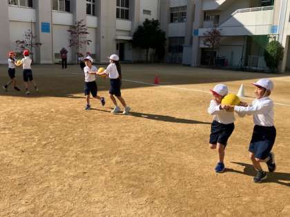2年生の体育の時間。寒くなりましたが、とてもいい天気で、お日さまの照ってる所は暖かくていい気持ちです。