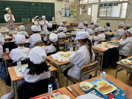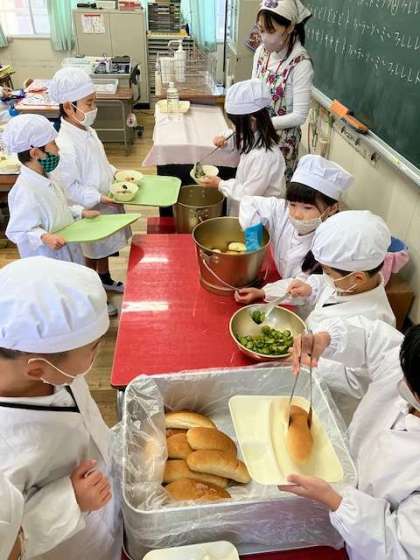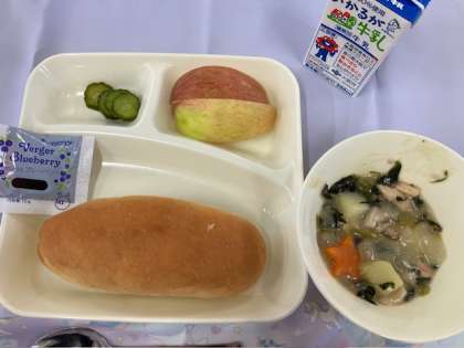 今日の給食献立は、コッペパン・鶏肉ときのこのシチュー・きゅうりのピクルス・りんご・ブルーベリージャム・牛乳です。