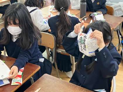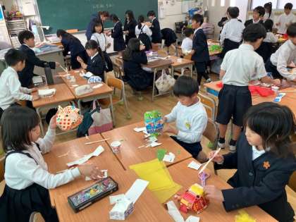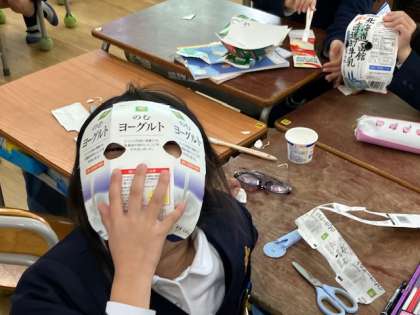 2年生の図工の時間。牛乳パックでお面づくりをしています。パックに色紙を付けたり、それぞれが工夫を凝らして楽しいお面を作ります。