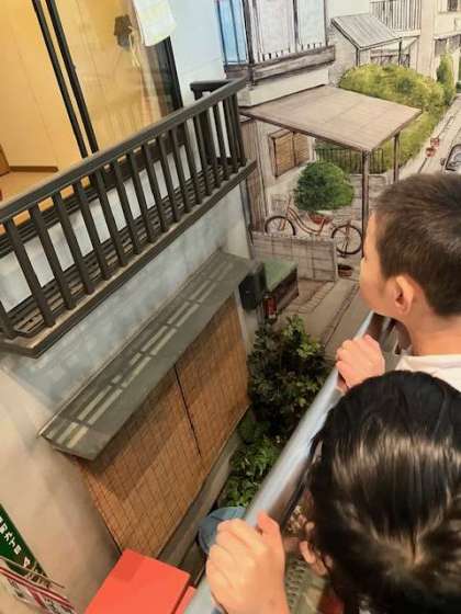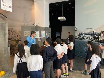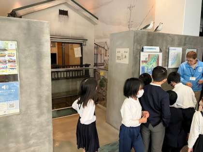 大正区の海抜0メートル地点の家、防潮堤の模型があります。実際に防潮堤のおかげで町が救われる状況を体感しました!