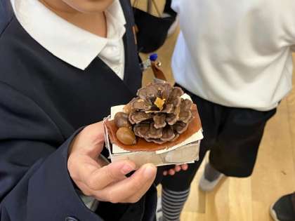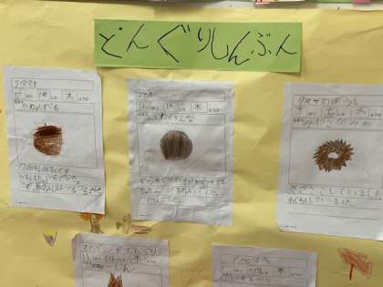 1年生の生活科で、どんぐりを使った遊び道具を作っています。