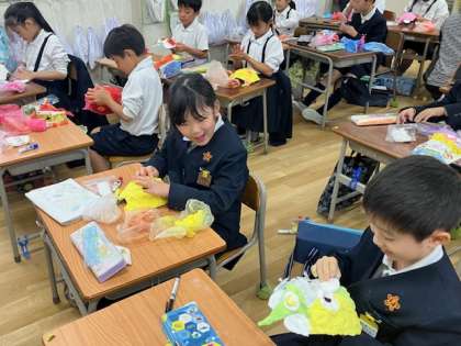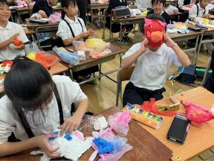 2年生のお面づくり。紙パックで作った土台に、紙粘土に色をつけて貼り付けていきます。
