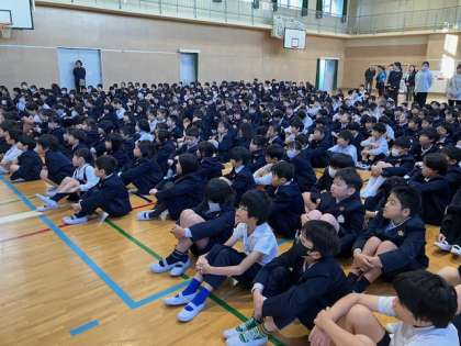 今日は月曜日、児童朝会の日です。校長先生からは、先週の2年生の校外学習で感心したことについてのお話しでした。
