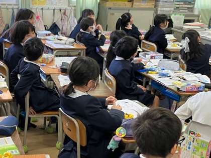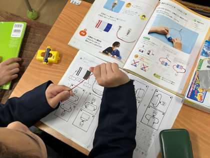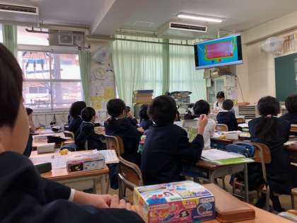 3年生の理科の授業です。豆電球を使って電気のことを学習しています。学習映像を見てる子どもたちは興味津々です!「どうなるか楽しみ〜!」と言いながら見ています。