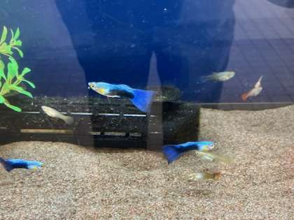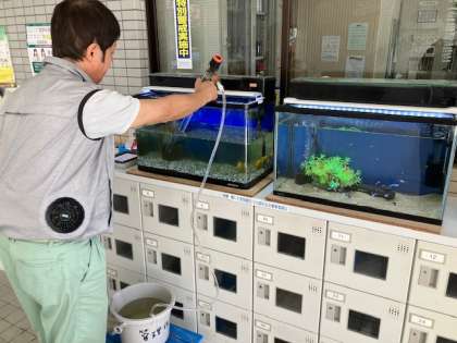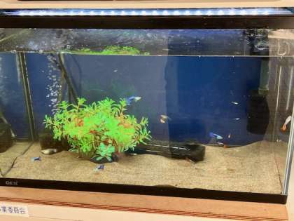 玄関の金魚とグッピー。すぐに水槽に藻や苔が生えて、水も濁ってきます。なので、毎週一回は管理作業員さんが水槽を掃除して水も換えてくれています。