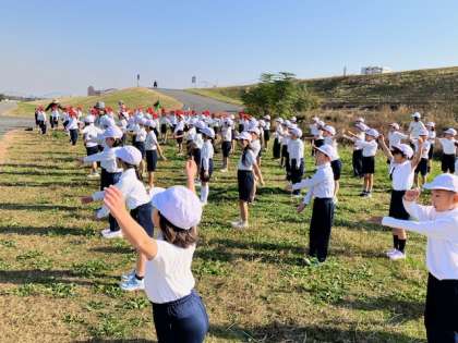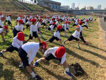 毛馬の閘門のすぐ横の土手を走ります。1・2年生は1.2Kmです。タイムは計りません。