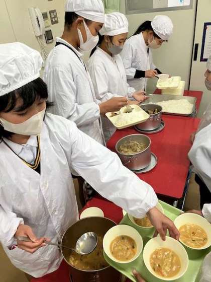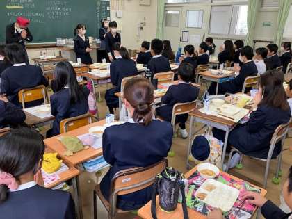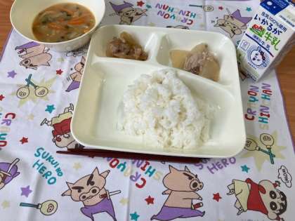 今日の給食献立は、ごはん・鶏肉の甘辛焼き・大根の煮物・味噌汁・牛乳です。