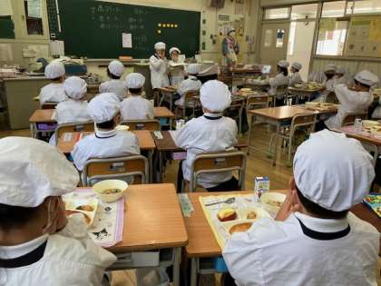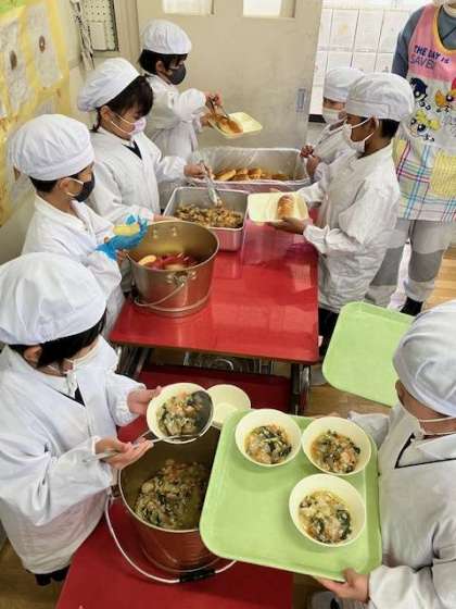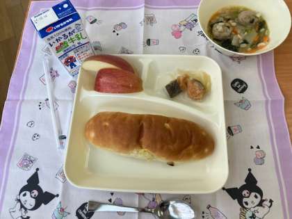 今日の給食献立は、おさつパン・鮭のマリネ・肉団子と押麦のスープ・に牛乳です牛乳です。