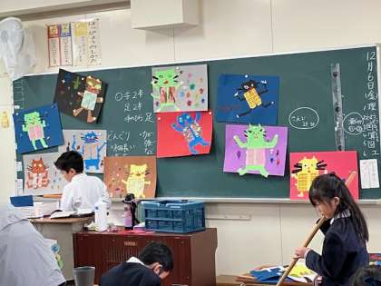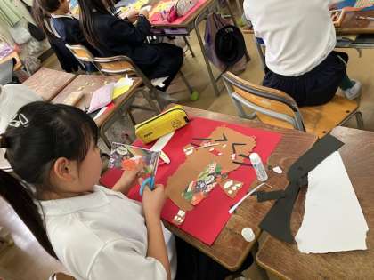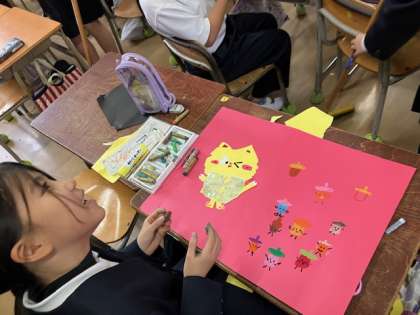 3年生では、国語で習った「どんぐりと山ねこ」のお話から、かわいい切り絵を作っています。