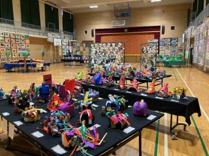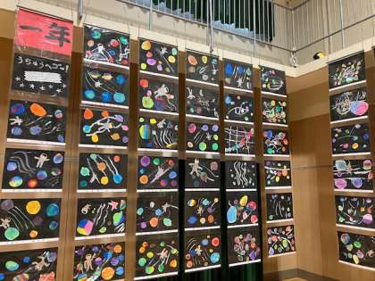 1年生は、図画作品は「宇宙へGO!」、工作作品は「すてきなぼうし」