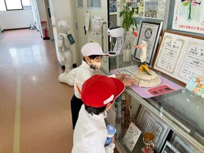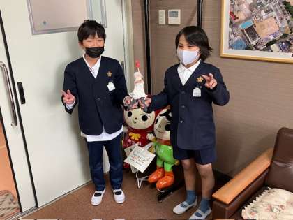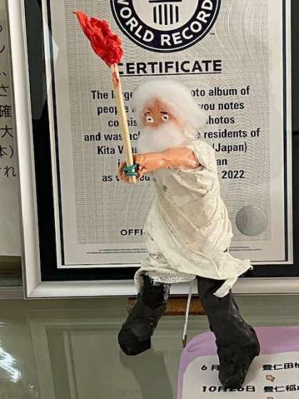 5年生が作品展で制作した林間学習の人物像。「火の神」を作った子が校長先生に作品を寄贈してくれました!
