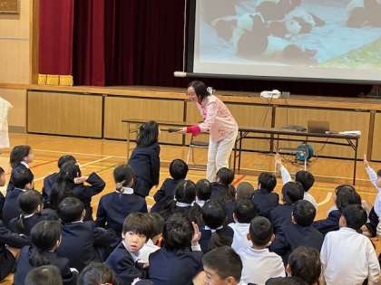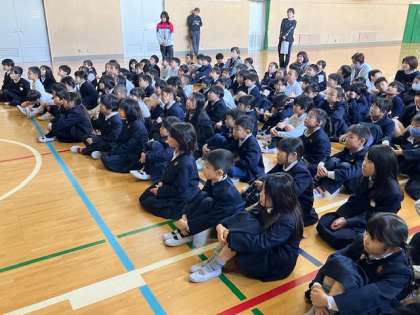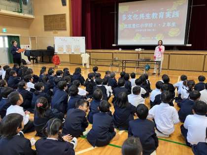 多文化共生教育の授業を、低中高学年別に行なっています。今日は1・2年生合同で、国際クラブの担当の老師(ラオシー 先生の中国語)から、中国の話を中心に、多文化を受け入れるための授業をしていただきました。