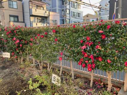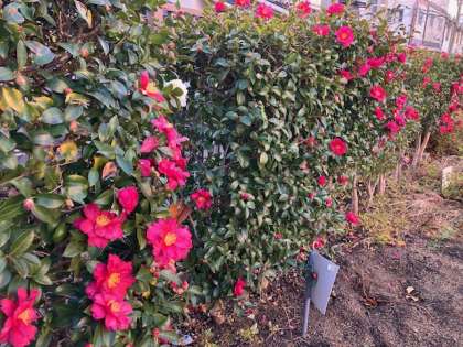 学校の塀沿いに植えてある寒椿(かんつばき)が満開です。寒さがきれいな赤色の花を咲かせてくれました。