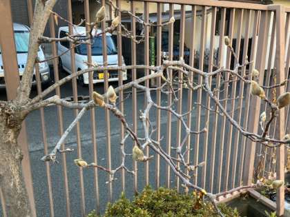 隣の木蓮(もくれん)は春の開花を待って大きな蕾(つぼみ)をふくらせています。
