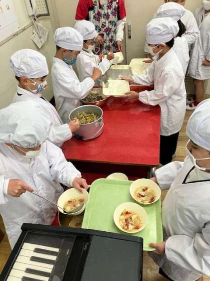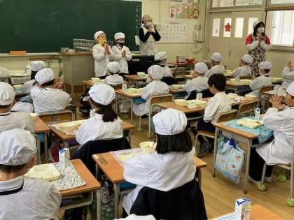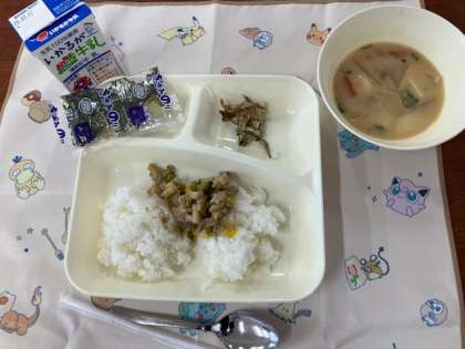 今年最初の給食献立は、お正月行事献立です。蓮根のちらし寿司・ごまめ・雑煮・牛乳です。