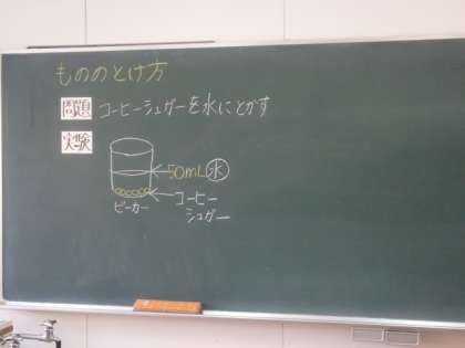 (写真中)コーヒーシュガーを水に溶かすには,どうすればいいかな?いろいろ試してみよう。