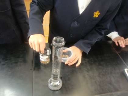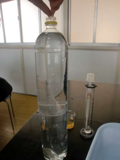 (写真下)水を入れた細長い容器に、食塩を入れてみると…