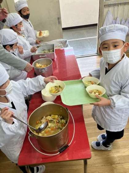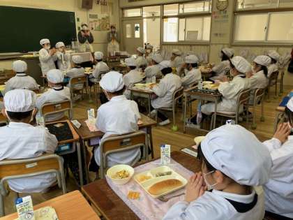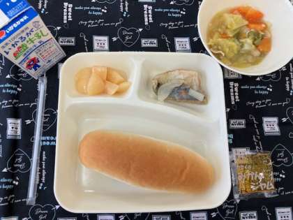 今日の給食献立は、コッペパン・鯵のレモンマリネ・てぼ豆のスープ煮・白桃(缶詰め)・みかんジャム・牛乳です。
