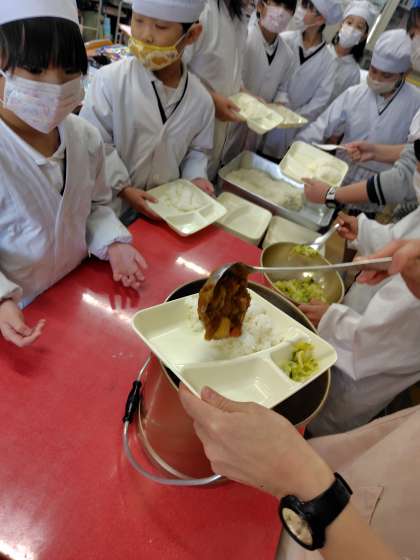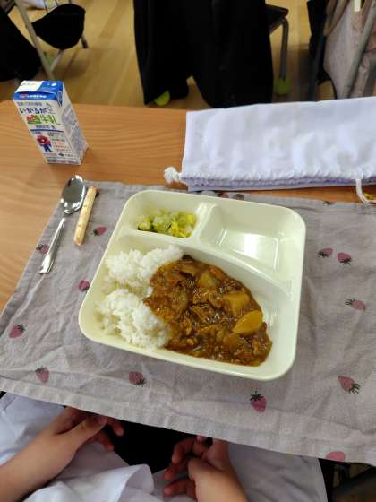 今日のこんだては、ごはん、牛乳、豚肉ときんとき豆のカレーライス、白菜のピクルス、ぼうチーズです。