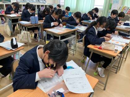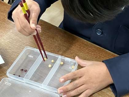 豊仁小学校では、明日、給食集会を行います。同時に、今週に毎年恒例の「豆つかみ大会」をクラスごとで実施します。今日は5年生のクラスで行っていました。