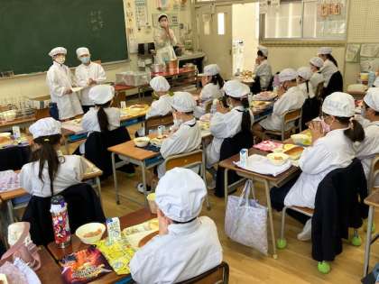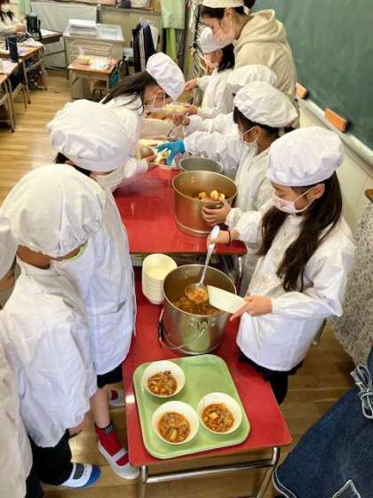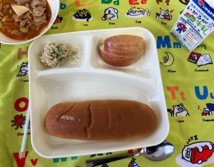 今日の給食献立は、黒糖パン・ケチャップ煮・ささみと野菜のソテー・りんご・牛乳です。