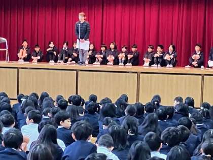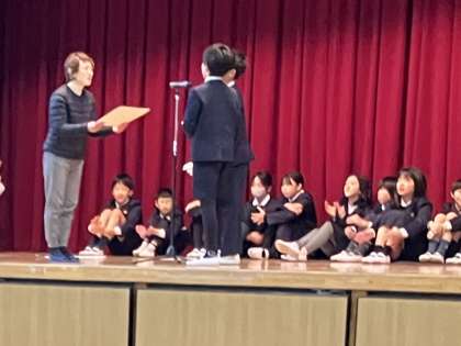 献立ランキング発表の次に、日頃、美味しい給食を作ってくださっている給食調理員さんの代表の方に、感謝状をお渡ししてお礼の言葉を述べました。