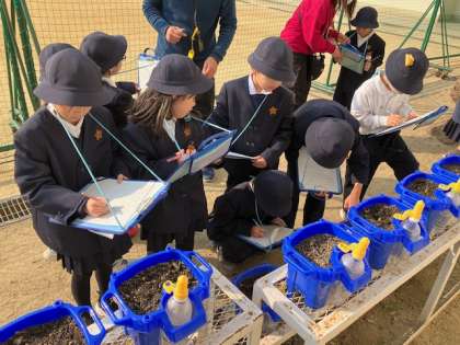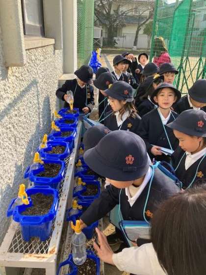 1年生が育てているチューリップ。少し緩んできたお天気の中で、芽が出てきました〜!