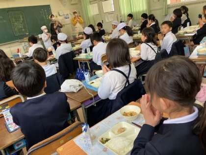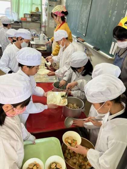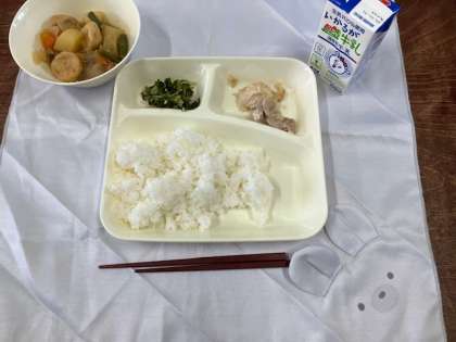 今日の給食献立は、ごはん・鶏肉のおろし醤油かけ・一口がんもとじゃがいもの味噌煮・みずなの煮びたし・牛乳です。