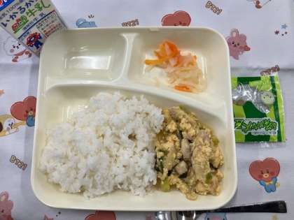 今日の給食献立は、親子丼・紅白なます・抹茶大豆・牛乳です。