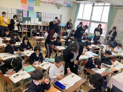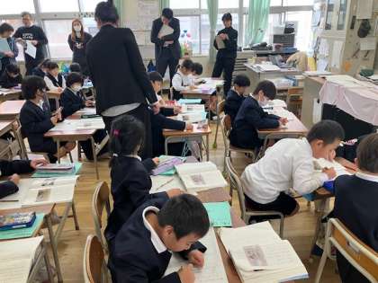 5時間め、1年生で国語の研究授業を行いました。豊仁小学校の先生方が見て放課後に全員で検討会を行います。教育委員会からも指導助言に来ていただいています。