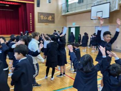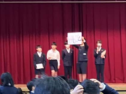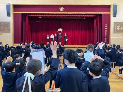 今日の集会は「かぶっちゃや〜よ」です。集会委員が出すお題3つから、一つ選んで、集会委員が選ぶ一つとかぶらないようにすればOKです。