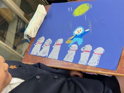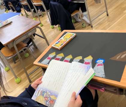 2年生の国語で学習する「かさこじぞう」。クレパスで描きました。