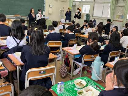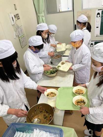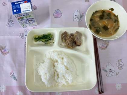 今日の給食献立は、ごはん・豚肉のごまだれ焼き・菊菜と白菜のおひたし・味噌汁・牛乳です。