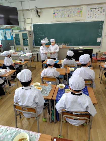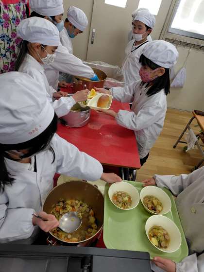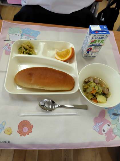 今日の給食献立は、パン、牛乳、ポトフ、カレーソテー、いよかんです。