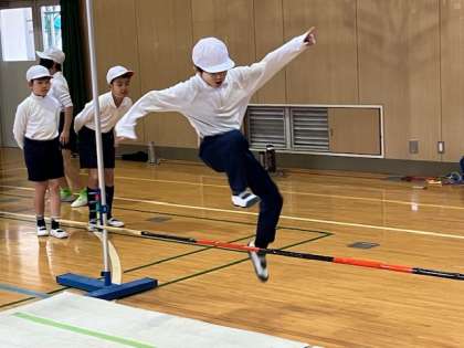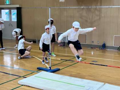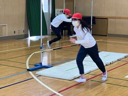 体育館で高跳びをしています。一見、バーがとっても低いように見えますが、ここからです。初めての高跳び。ここから将来の高跳び選手になるかもです。