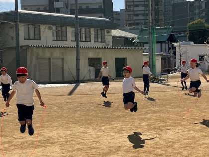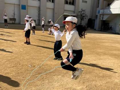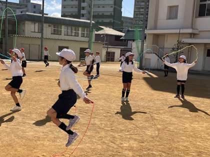 3年生の体育の授業。なわとび週間は終わりましたが、この機会に「より上手く!」をめざしてなわとびも取り入れています。