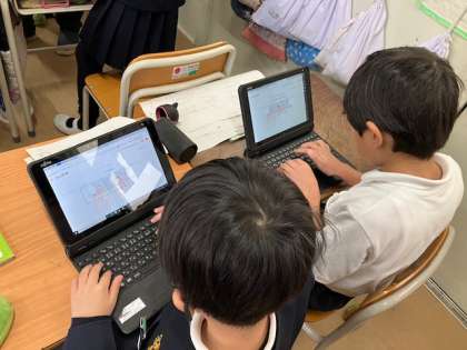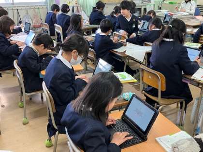 3年生の教室。パソコンの授業をしています。今回は、タイピングを中心にした練習です。