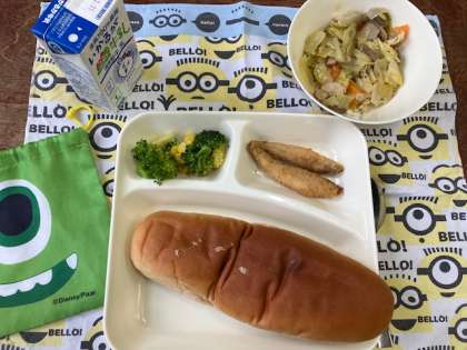 今日の給食献立は、黒糖パン・わかさぎフライ・ブロッコリーとコーンのサラダ・スープ煮・牛乳です。