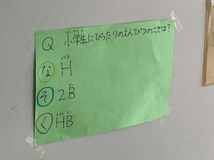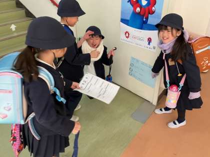 児童会運営委員会からの挑戦状を受けて、みんな、クイズポスターを探し回っています。