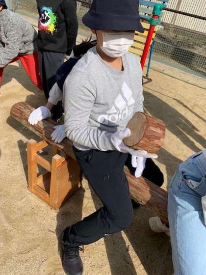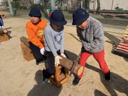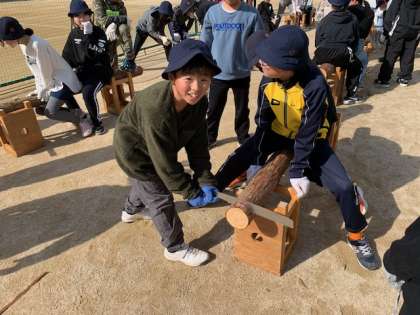 教えてもらう時間が済むと、自分たちで丸太切りに挑戦です。二人がかりで丸太を抑えて、一人がゴーシゴーシ!だんだんと面白くなってきました〜。